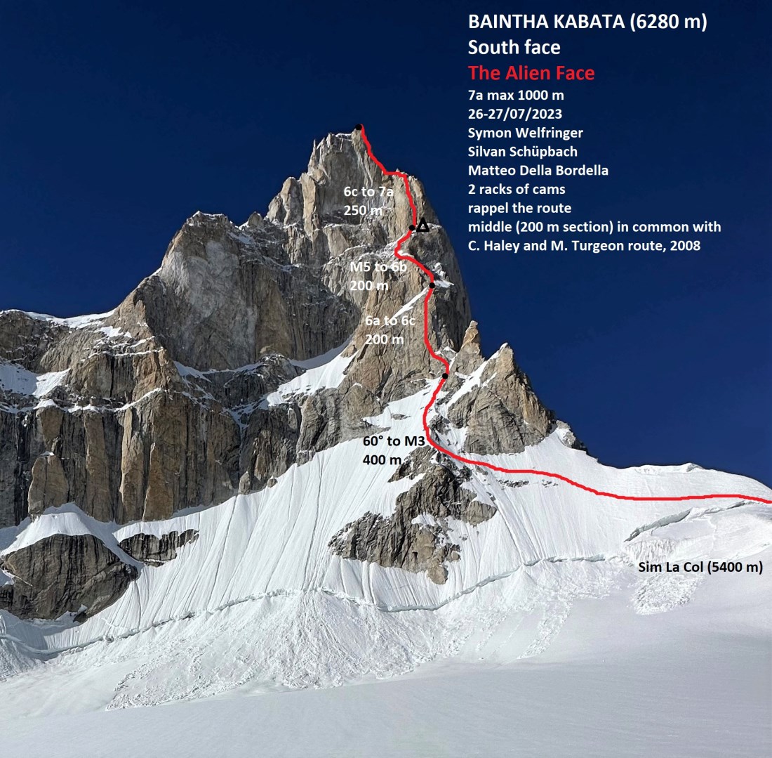 The Alien Face: così si chiama la nuova via aperta a inizio agosto da Matteo Della Bordella, Silvan Schüpbach e Symon Welfringer lungo il pilastro sud del Baintha Kabata. Il Baintha Kabata, con i suoi 6250 m di altitudine, si trova in Pakistan, nel massiccio del Karakorum.